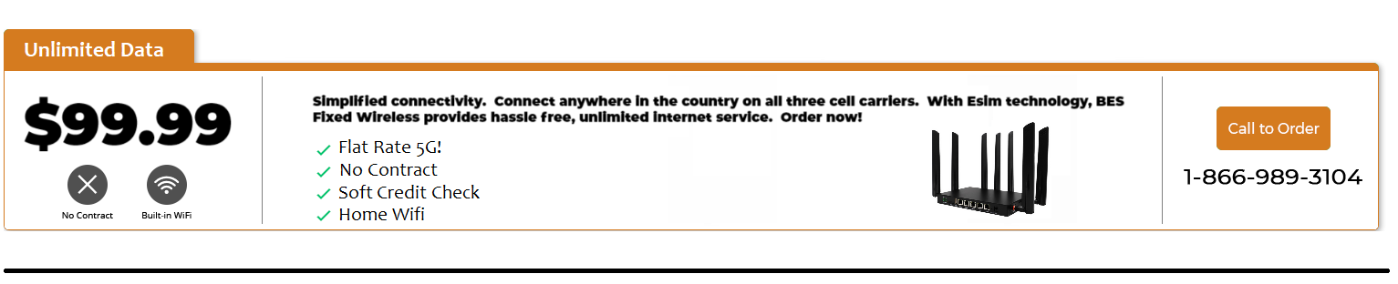BES Fixed Wireless uses signals from all three major cellular carriers (AT&T, Verizon, T-mobile) to provide WiFi and wired broadband internet to your home, RV or boat. BES Fixed Wireless is superior to hot spot or tethering with your smart phone because the BES MODEM is specifically designed to provide broadband internet service to multiple devices. Also, most phone data plans are designed for casual use and can only provide from five to ten GB of hotspot data usage per month. BES offers unlimited data plans with no contract or credit check required. In addition, BES offers a 14 Day No Risk Money Back Guarantee on hardware.*